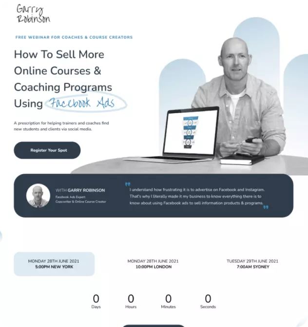 Garry Robinson is a Facebook Advertising Expert and Copywriter based in Sydney, Australia. His Social Media Advertising Agency focuses on fixing 3 of the biggest pain points that coaches and online course creators alike face when advertising on social media: the high costs of getting started, the complexity of targeting the right audience, and the confusion around what kind of messaging to include in ads.
