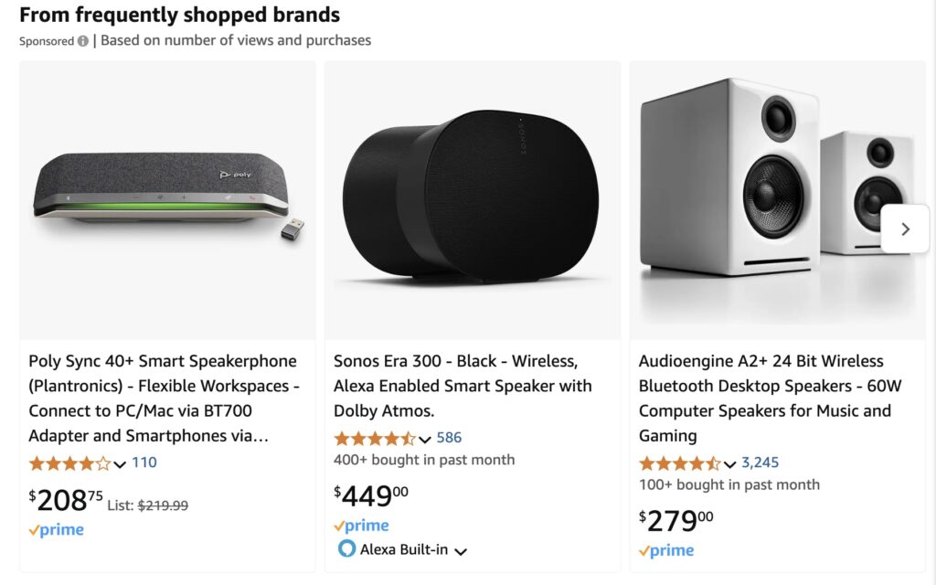 For instance, the image below shows some listings promoted on Amazon when searching for “smart speakers”. As you can see, the platform promotes relevant products and the native feel makes them fit seamlessly into the page with other listings.