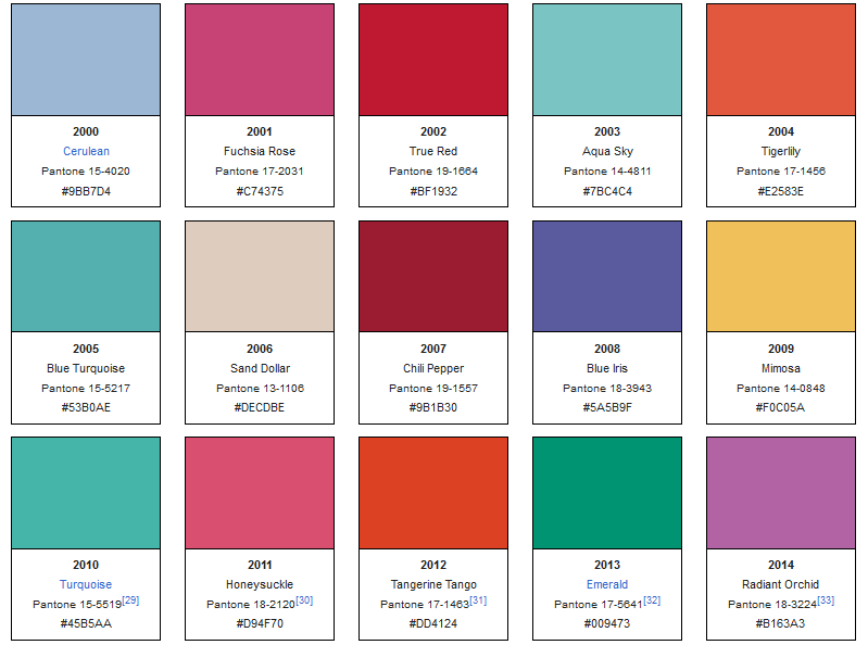 The below images show every single Color Of The Year announced since 2000. Of these, we’ll be looking at the ones from the last decade, from 2010 onward.