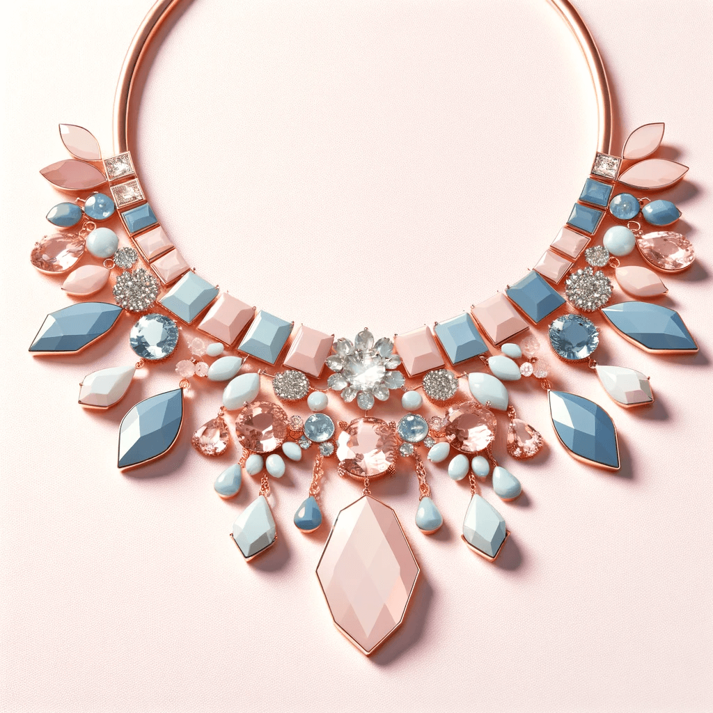 The below image shows DALL.E’s rendition of “a chic statement necklace, seamlessly blending the gentle and soothing tones for an elegant accessory”.