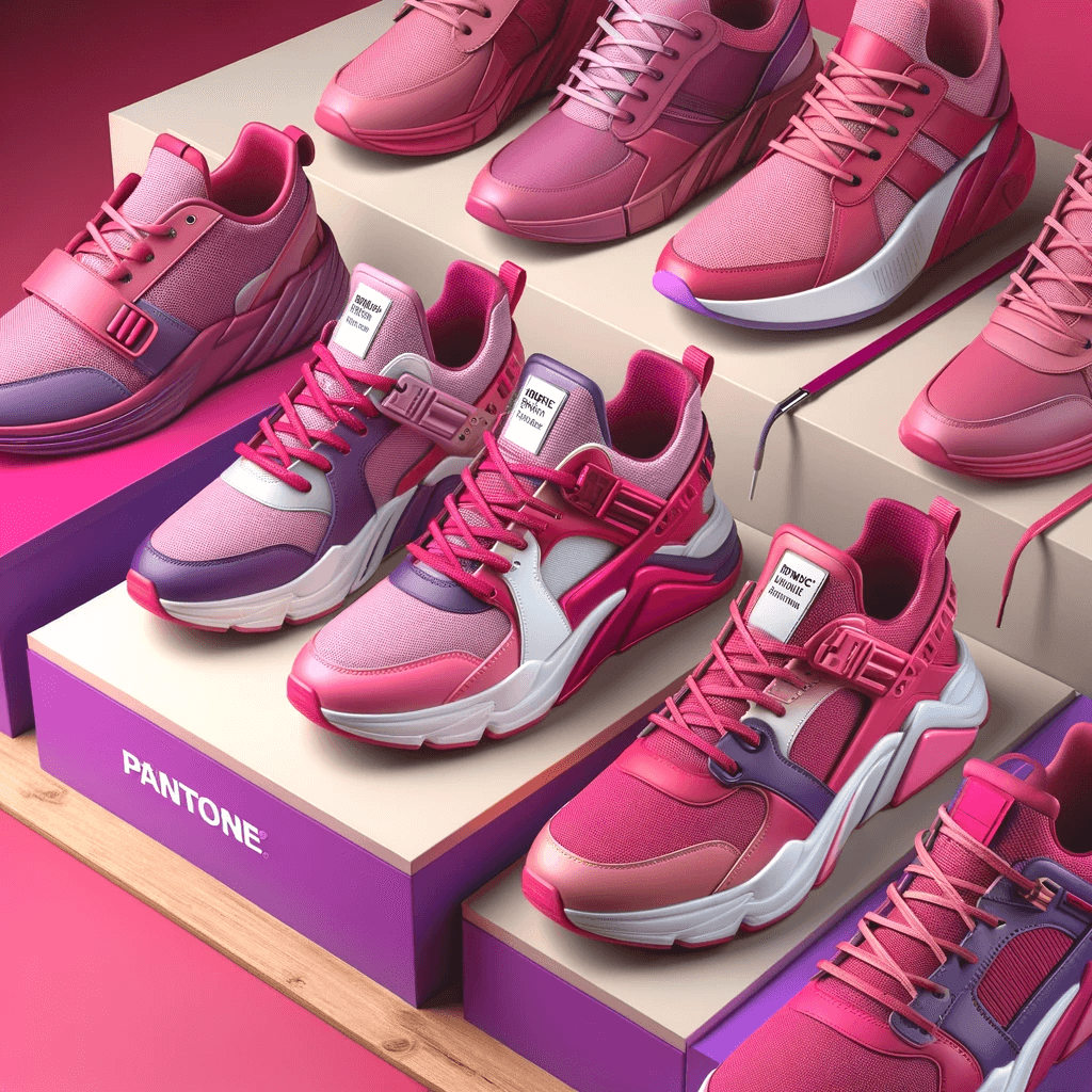 The below image shows a vibrant sneaker collection featuring Viva Magenta as imagined by DALL.E.