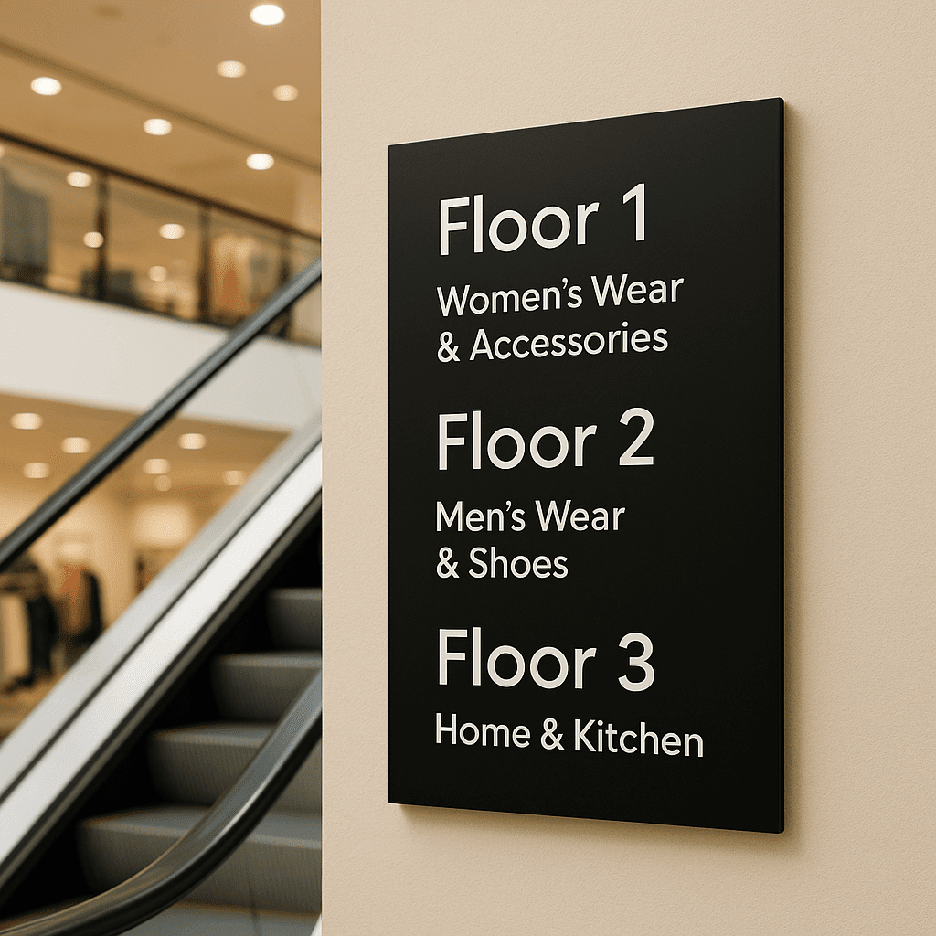 Informational signage in a store is also used to ensure smooth navigation through the store and a seamless shopping experience all the way up to the checkout. Imagine walking into a multi-storeyed store, moving from one floor to another, not knowing where to find what you are looking for. Or not knowing where the changing rooms are or the checkout counter.