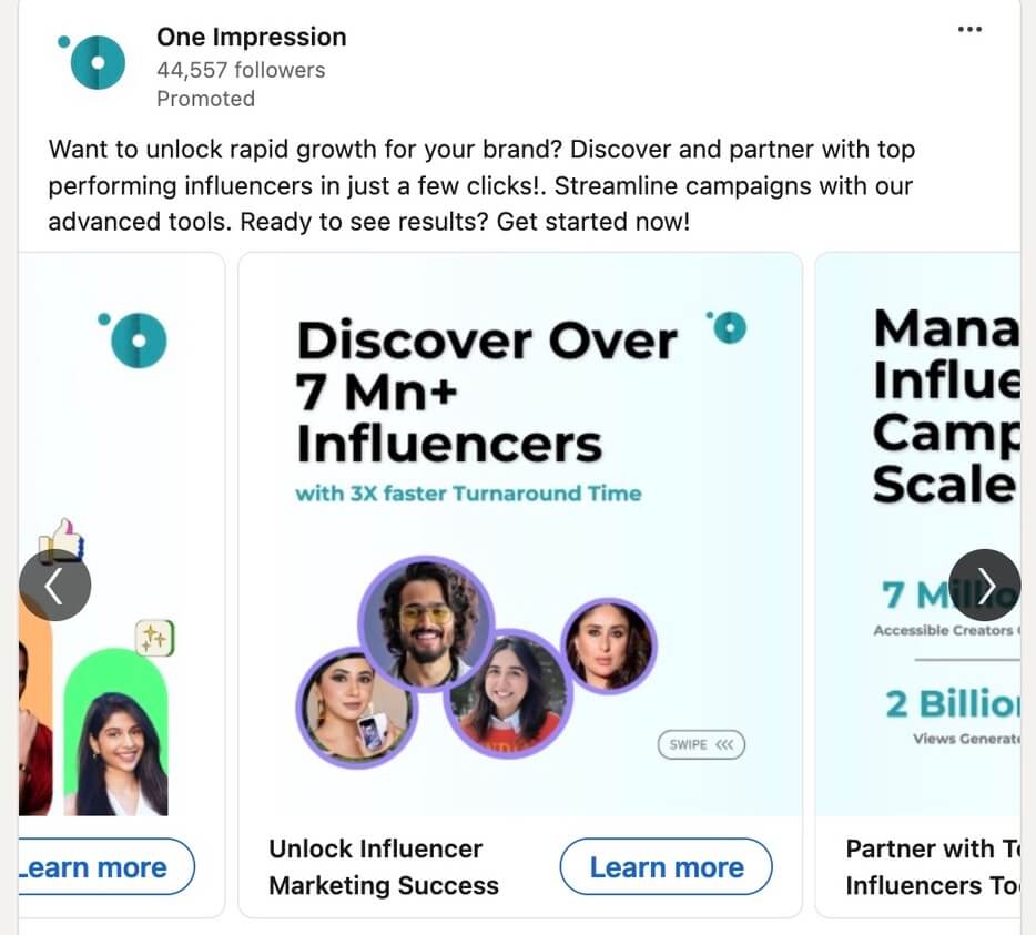 Depending on the purpose of the ad, add the same or different links and CTAs to each slide in your image. However, similar to image ads, keep text to a minimum and use engaging visuals to communicate your message clearly without overwhelming the audience. The crisp text in the below LinkedIn carousel ad makes it easy to navigate through.