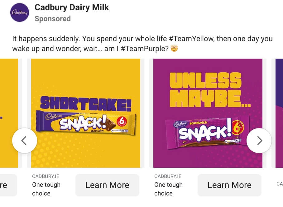 Ensure sequential presentation and an instantly recognizable connection between your slides and the ad description text. They should all work synchronously to present the core message. The Facebook carousel here from Cadbury achieves that with minimal text and brilliant use of social media lingo as well.