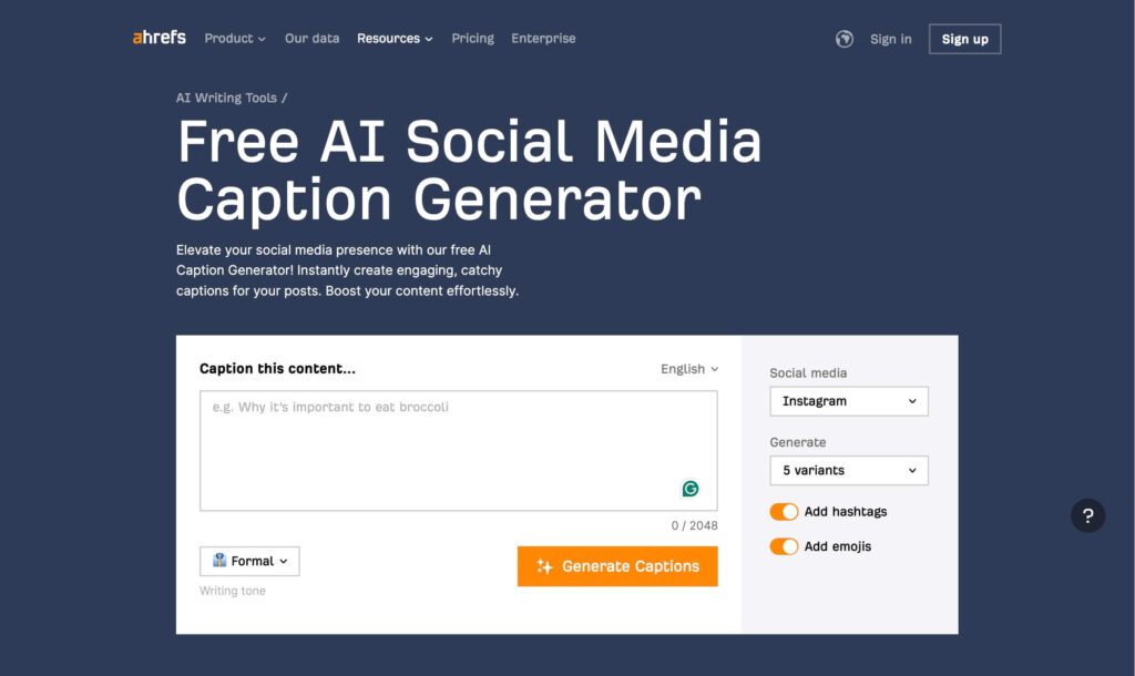 Need a quick and easy tool that’s also free? Then Ahrefs’ AI Caption Generator is a great option. Simply describe your post and select the desired tone for your caption and the tool generates the caption for you.