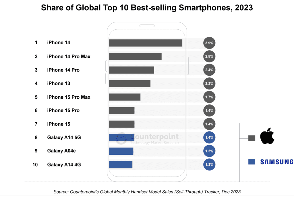 Knowingly or unknowingly, the iPhone 14 Plus model acted as a decoy in this case because who would pay $100 more just for a bigger screen and without a significant boost to the features? The iPhone 14 Pro and Pro Max with better processor and camera capabilities appear as the better value options. Naturally, in 2023, iPhone 14, 14 Pro Max, and 14 Pro turned out to be the bestsellers.