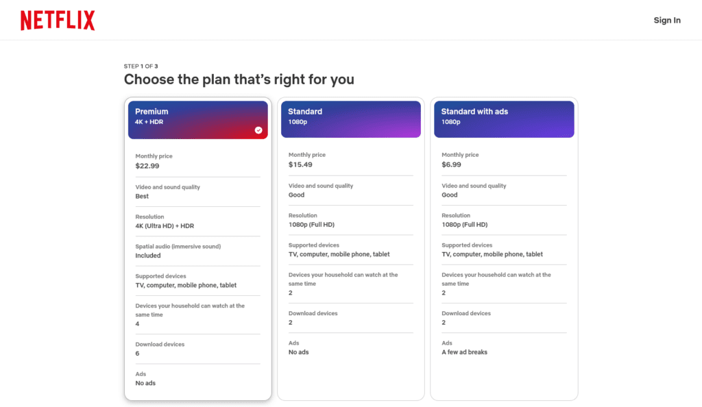 In this case, if the Standard With Ads plan was not there, the starting price of $15.49/month would probably have appeared too expensive for a streaming service. However, the ad-supported plan and its downsides make the Standard plan look more attractive. This also increases the chances of users considering the Premium Plan without regrets especially knowing that they are getting a significant upgrade of features.