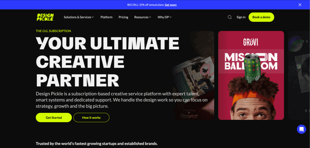 As one of the longest-running subscription-based creative platforms, Design Pickle is among the best unlimited graphic design services for startups. What stands out is that Design Pickle uses an hours‑based system where startups reserve daily design capacity. This means that your dedicated design team assigns the chosen number of hours every business day to work on your design requests.