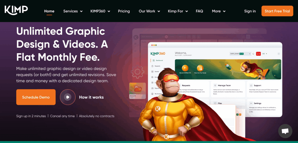But remember, some have low entry barriers with affordably priced plans, and others have the benefit of multiple active requests. A few have the benefit of dedicated design teams with diverse talents taking care of your varying design needs. If you need a service that balances almost all these traits, KIMP stands out. Dedicated design team and project manager, Canva support, fast turnaround times, 3 active requests, KIMP360 for project management, and other benefits make KIMP a confusion-free, convenient service to work with.