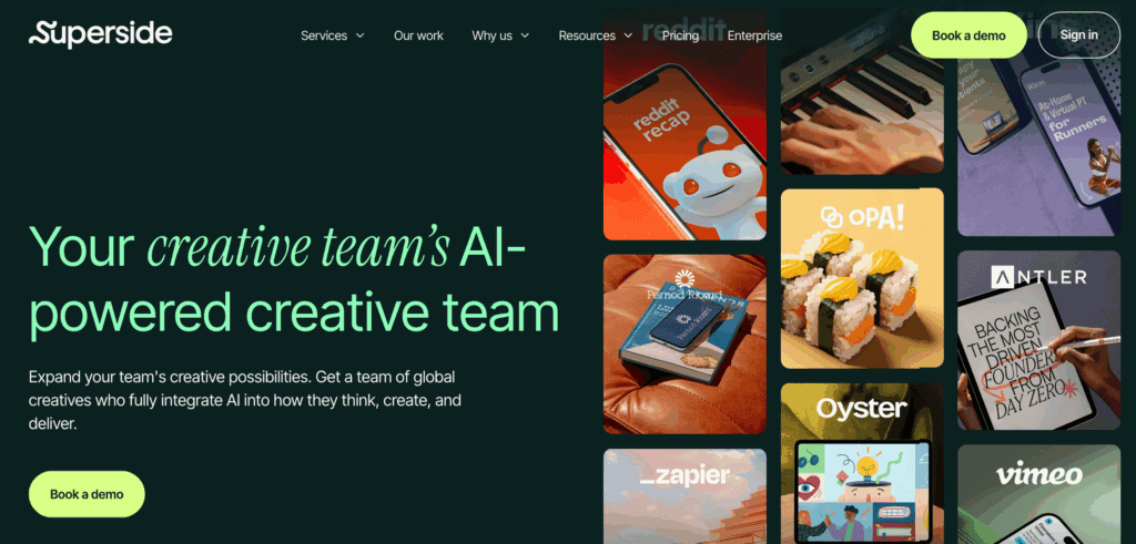 As one of the rapidly growing unlimited graphic design services for startups, Superside positions itself as a premium creative partner offering an AI-powered creative team.
