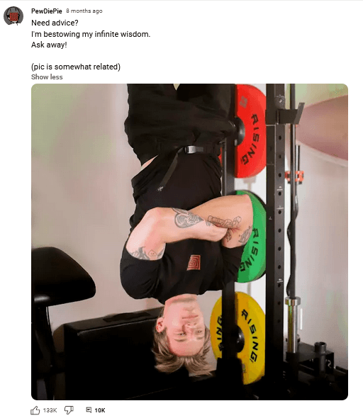 The below Community Post is from the YouTube channel of renowned YouTuber PewDiePie. Here he created a space for his subscribers to ask him questions.