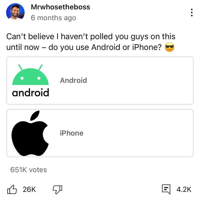 Another is to use polls to understand your audience demographics better. YouTuber Mrwhosetheboss shares content about the latest gadgets. Therefore, his poll in the YouTube Community Post here can help him understand whether his subscribers are mostly Android users or iOS users.