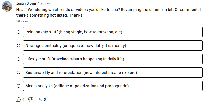 In the below Community Post, YouTuber Justin Brown uses the poll option to gather the opinions of his subscribers about the type of videos they like to see more. This is one way to tailor content to the interests of your audience.