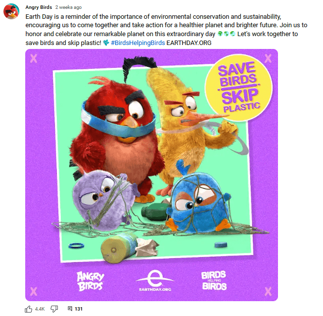 For instance, the Angry Birds channel posted the below Community Post for Earth Day. besides seasonal content like this one, they regularly add engaging GIFs and intriguing quizzes that keep Angry Birds fans engaged.