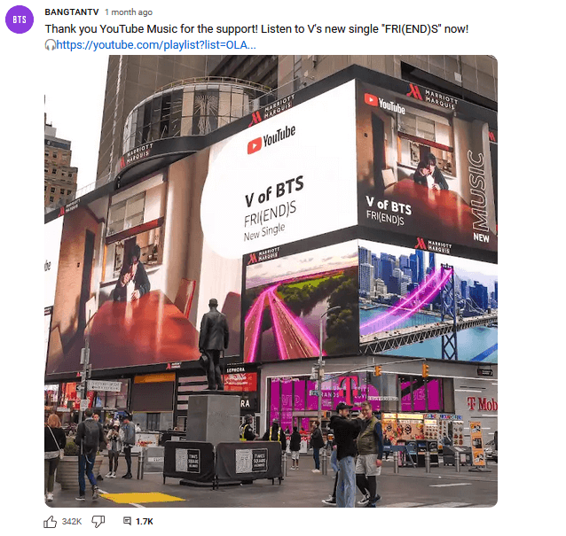 The below Community Post on the official channel of BTS, BANGTANTV, gives a nod to YouTube Music for promoting their new single in their outdoor ads.